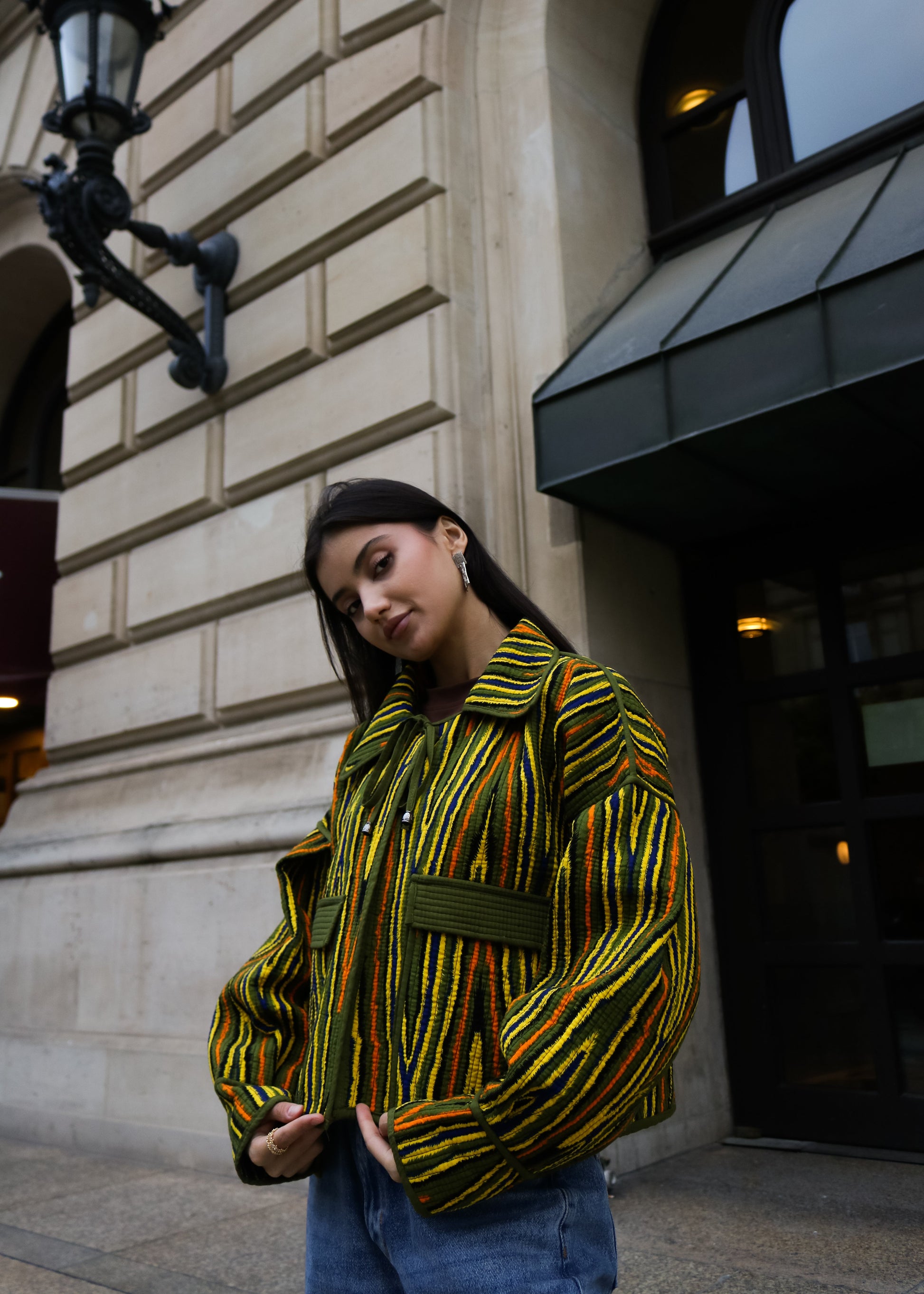 Diese handgefertigte Jacke im modernen, verkürzten Schnitt ist ein einzigartiges Kleidungsstück traditioneller zentralasiatischer Handwerkskunst. Aus einem Baumwolle-Seiden-Mix gewebt, vereint sie Leichtigkeit, Eleganz und höchsten Tragekomfort.