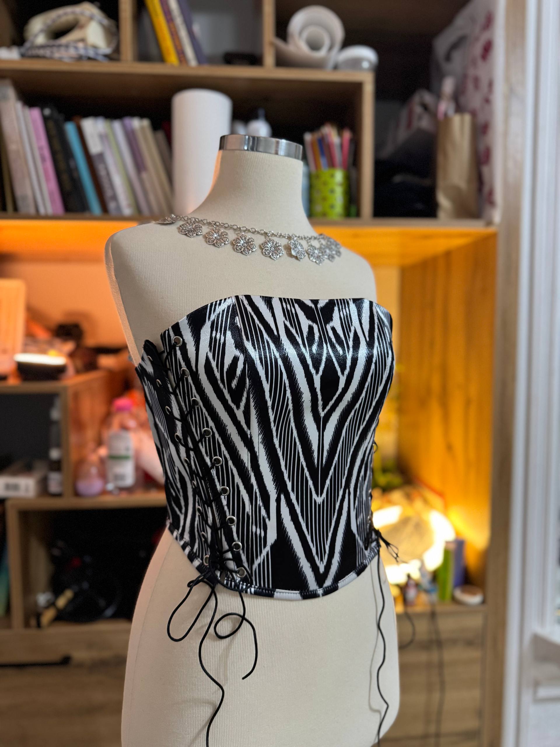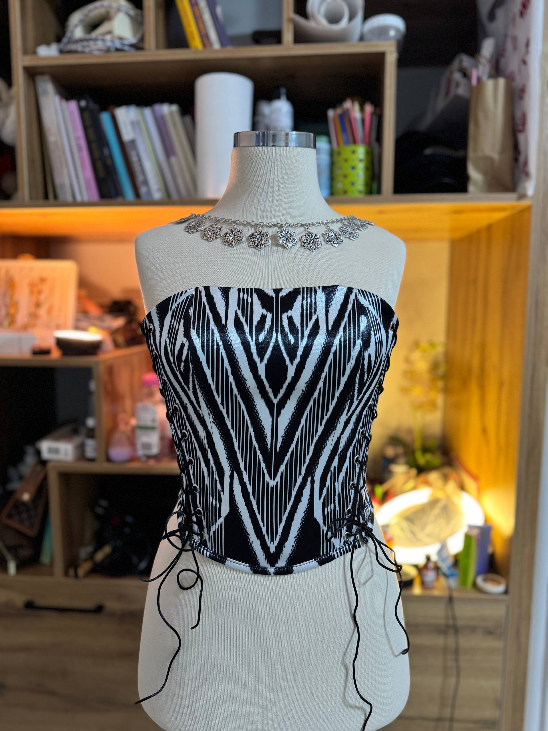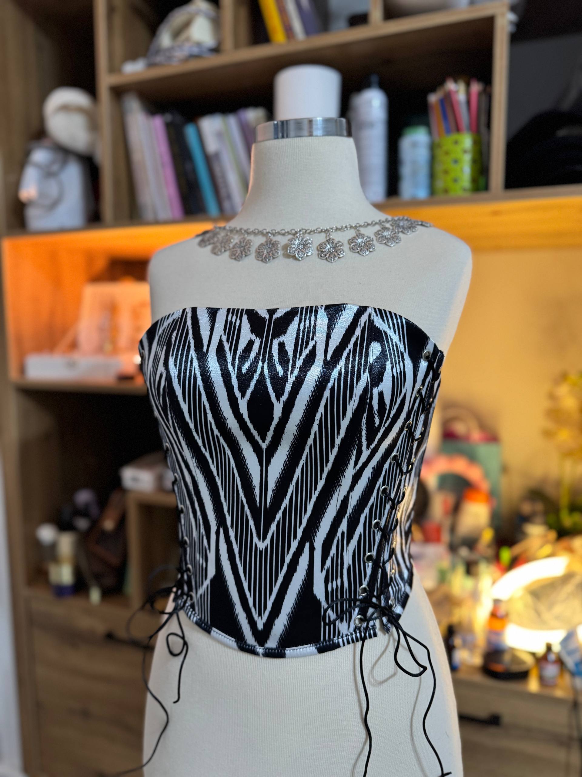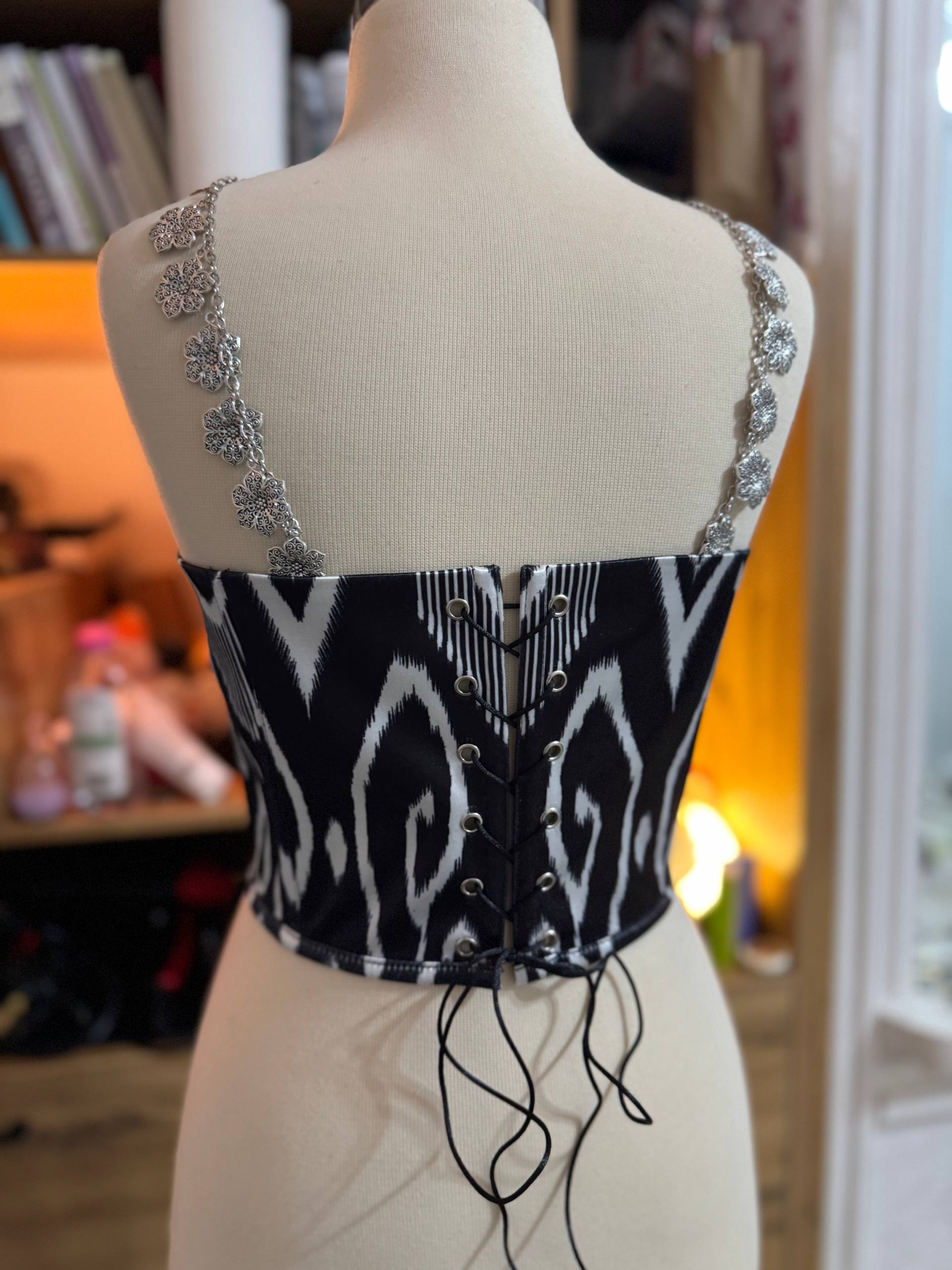 Ein elegantes Korsett aus hochwertigem Satin mit traditionellem usbekischem Muster im Atlas-Stil.