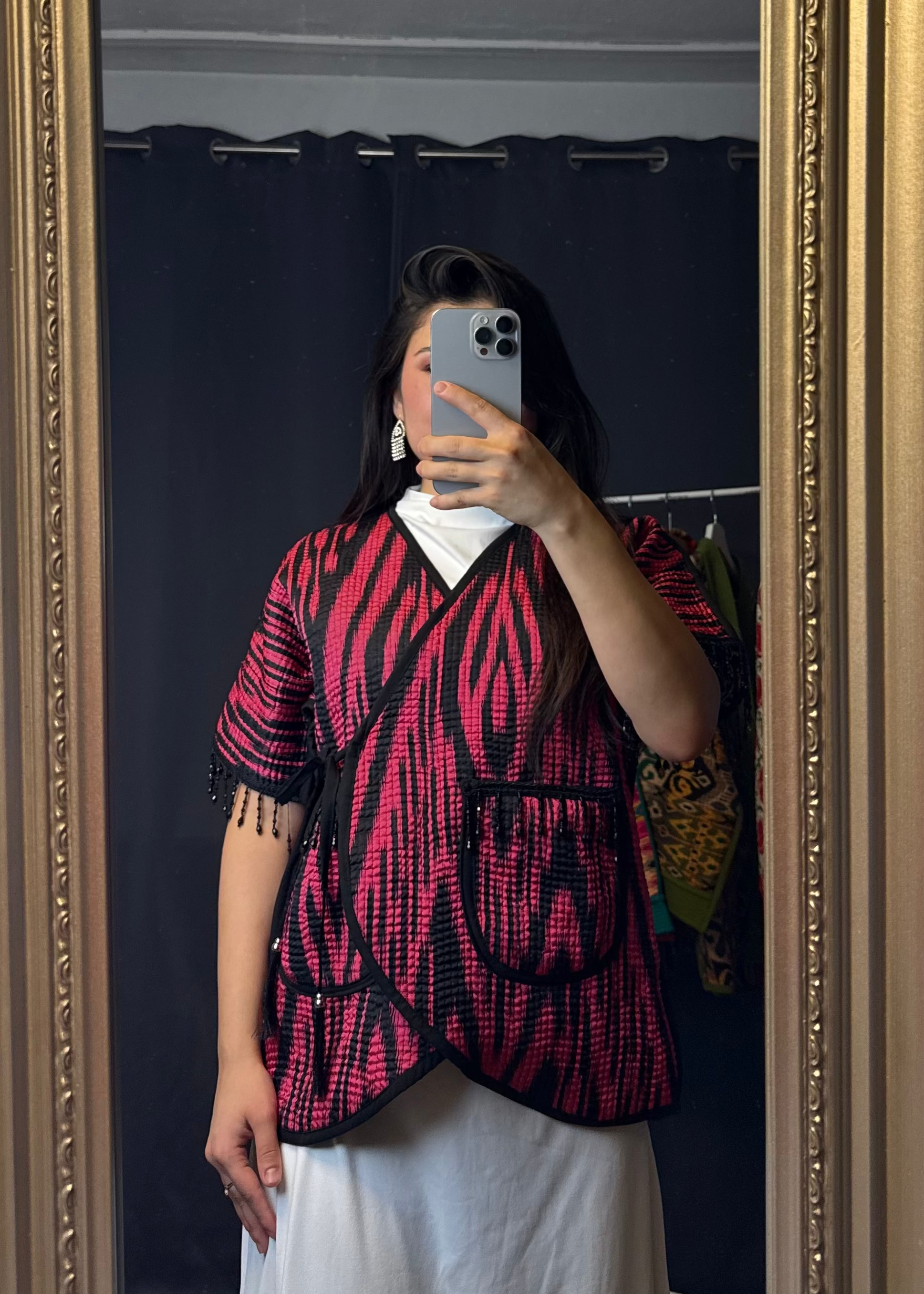 Diese Weste ist ein einzigartiges Statement-Piece, das traditionelle zentralasiatische Handarbeit mit modernem Design verbindet.