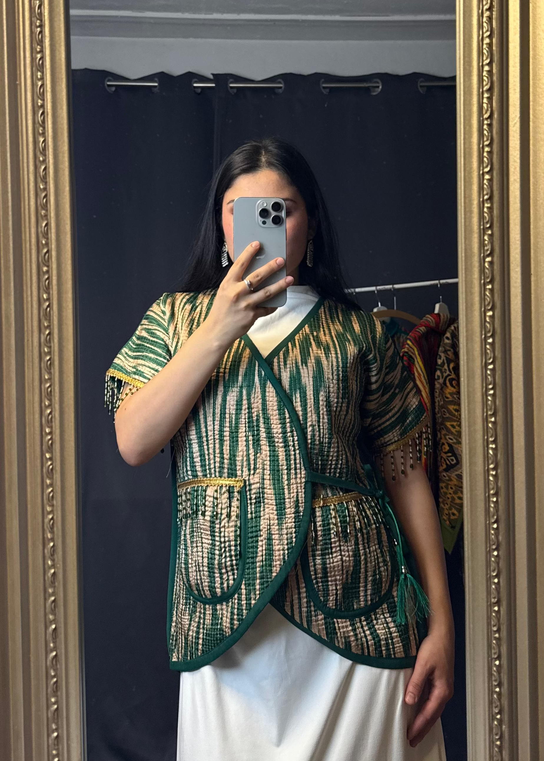 Diese Weste ist ein einzigartiges Statement-Piece, das traditionelle zentralasiatische Handarbeit mit modernem Design verbindet.