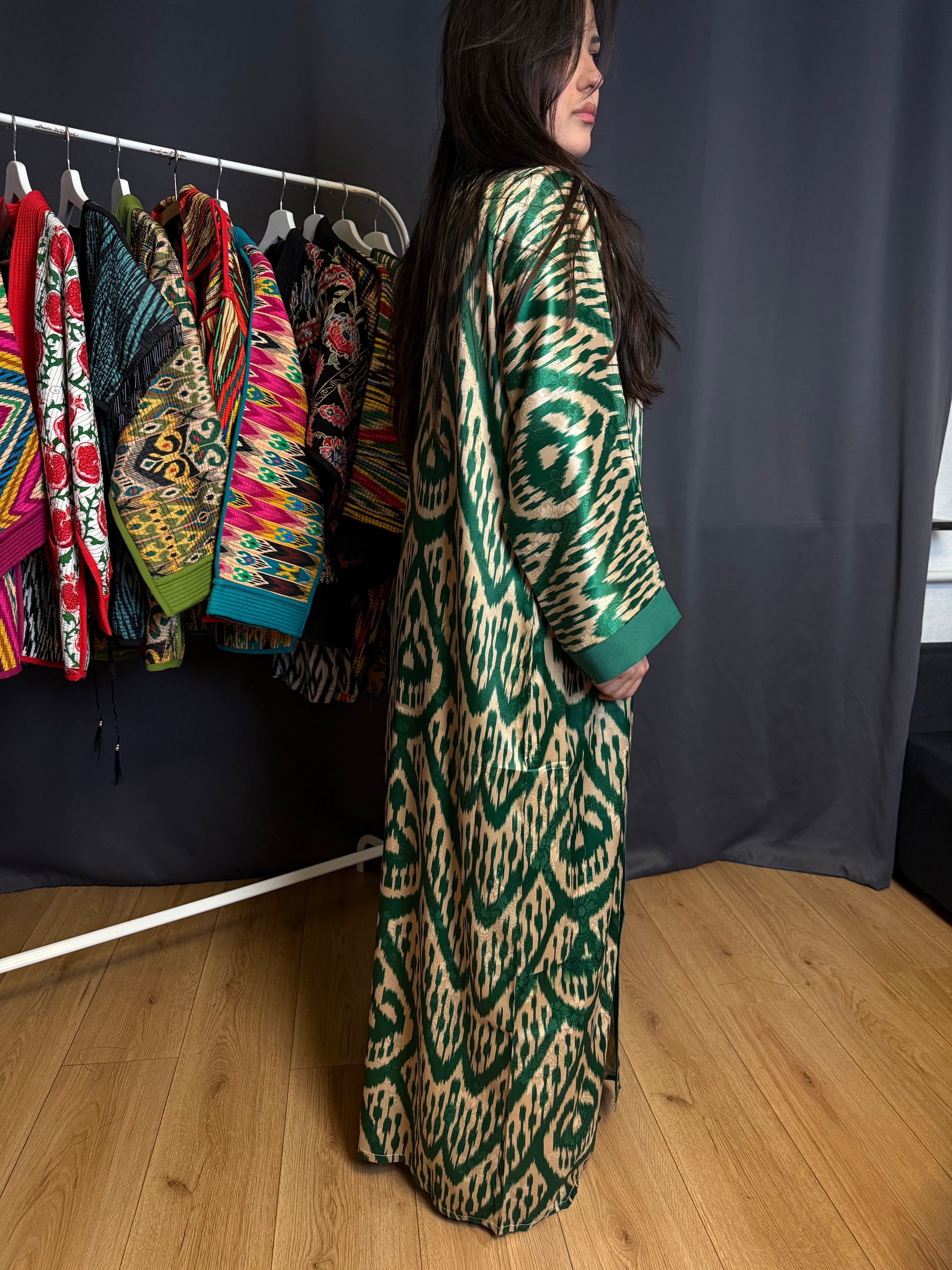 Eine elegante, harmonische Abaya in Smaragdgrün mit traditionellem Ikat/Adras-Muster.
