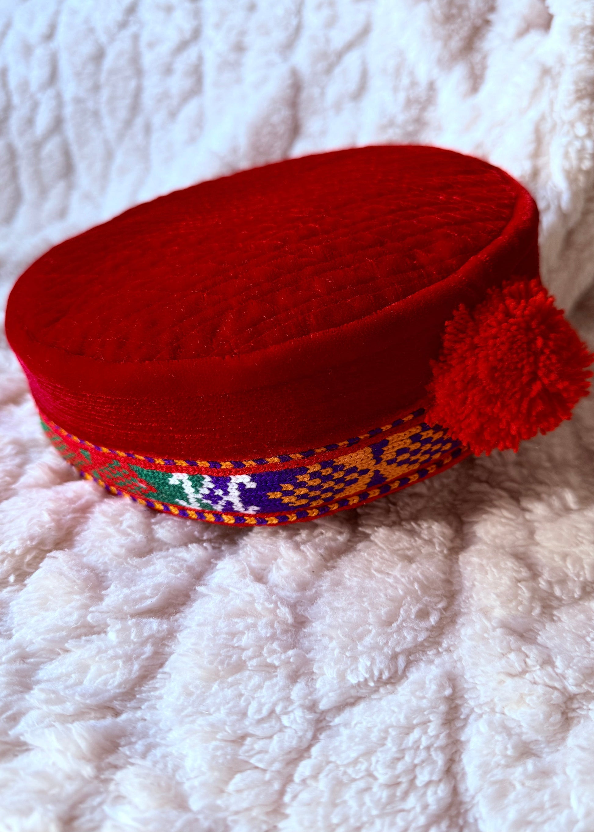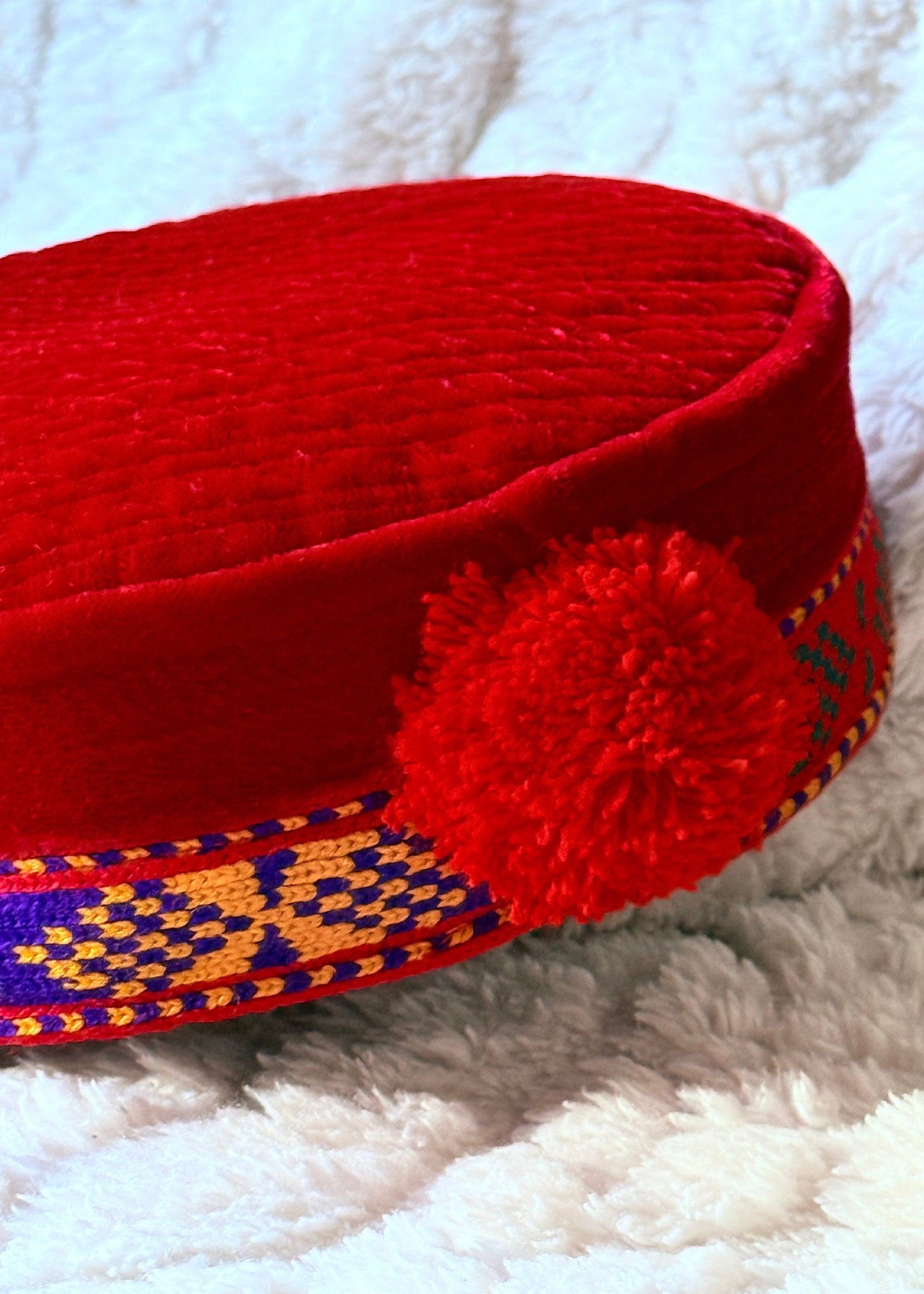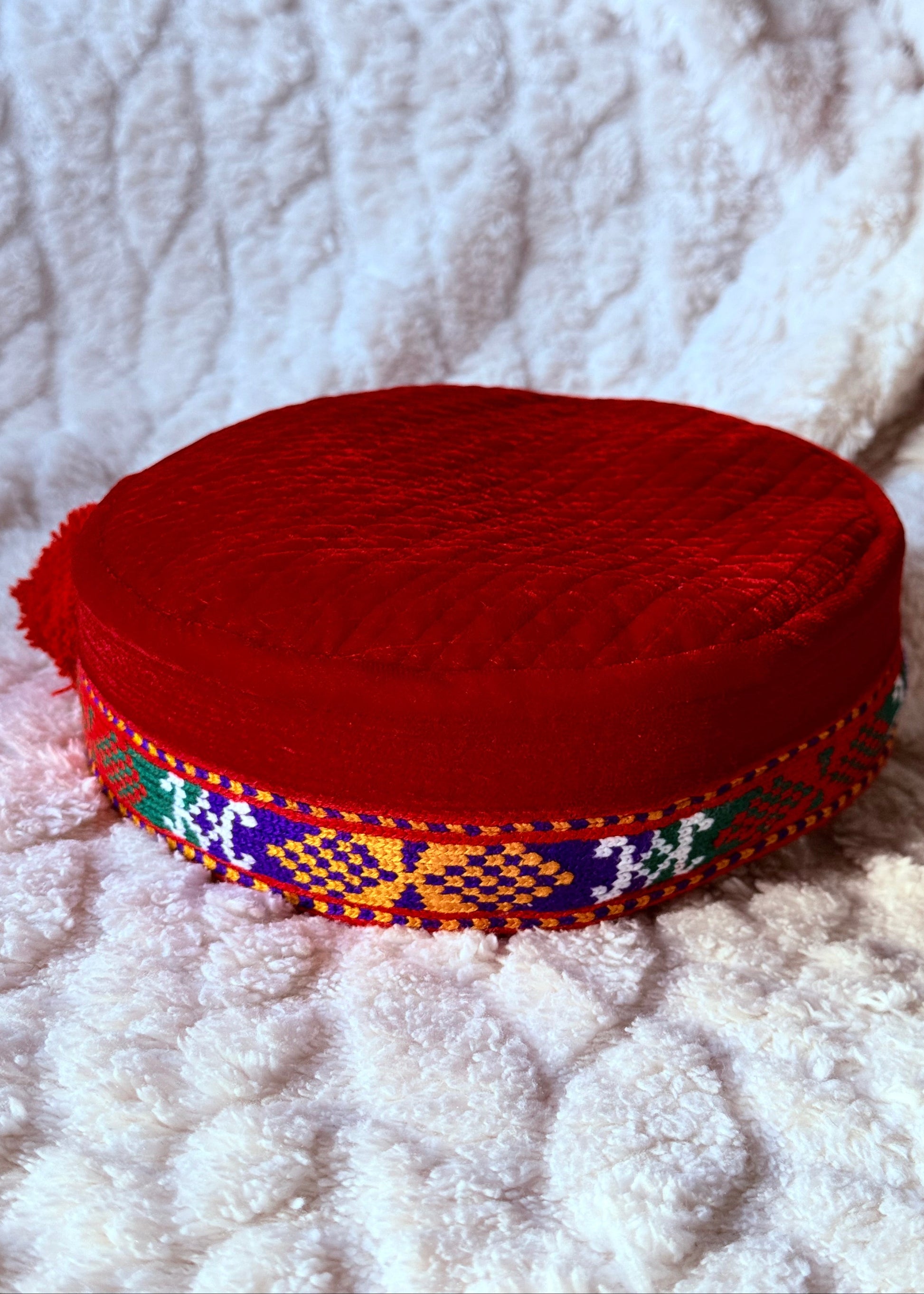 Die Mütze besteht aus einem weichen, hochwertigen Stoff in kräftigem Rot, kombiniert mit einem aufwendig gewebten, farbenfrohen Band, das typische Muster der pamirischen Kultur zeigt. Innen ist sie sorgfältig gepolstert und fein abgesteppt, sodass sie angenehm sitzt und ihre Form perfekt behält.