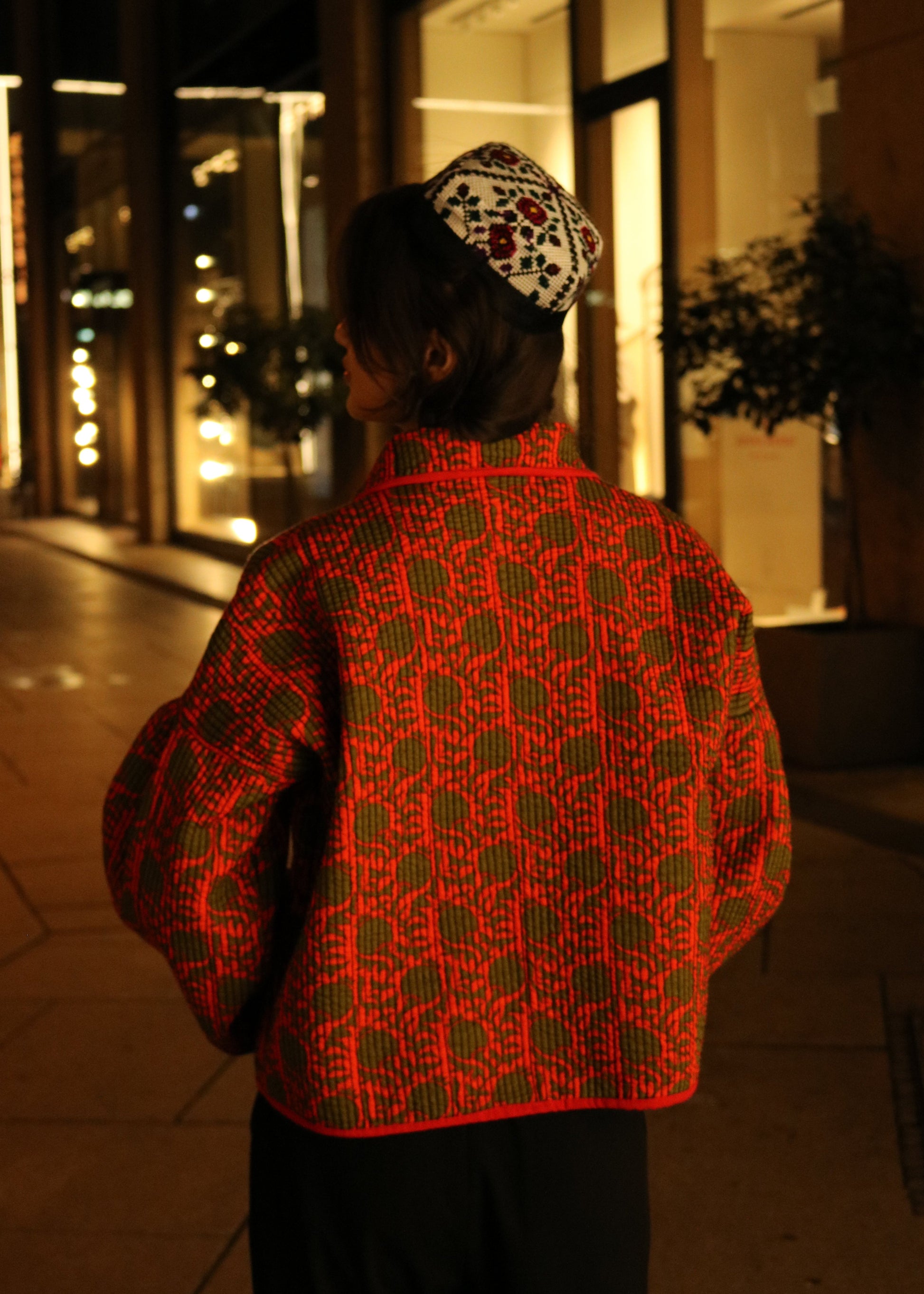 Diese handgefertigte Jacke im modernen, verkürzten Schnitt ist ein einzigartiges Kleidungsstück traditioneller zentralasiatischer Handwerkskunst. Aus einem Baumwolle-Seiden-Mix gewebt, vereint sie Leichtigkeit, Eleganz und höchsten Tragekomfort.