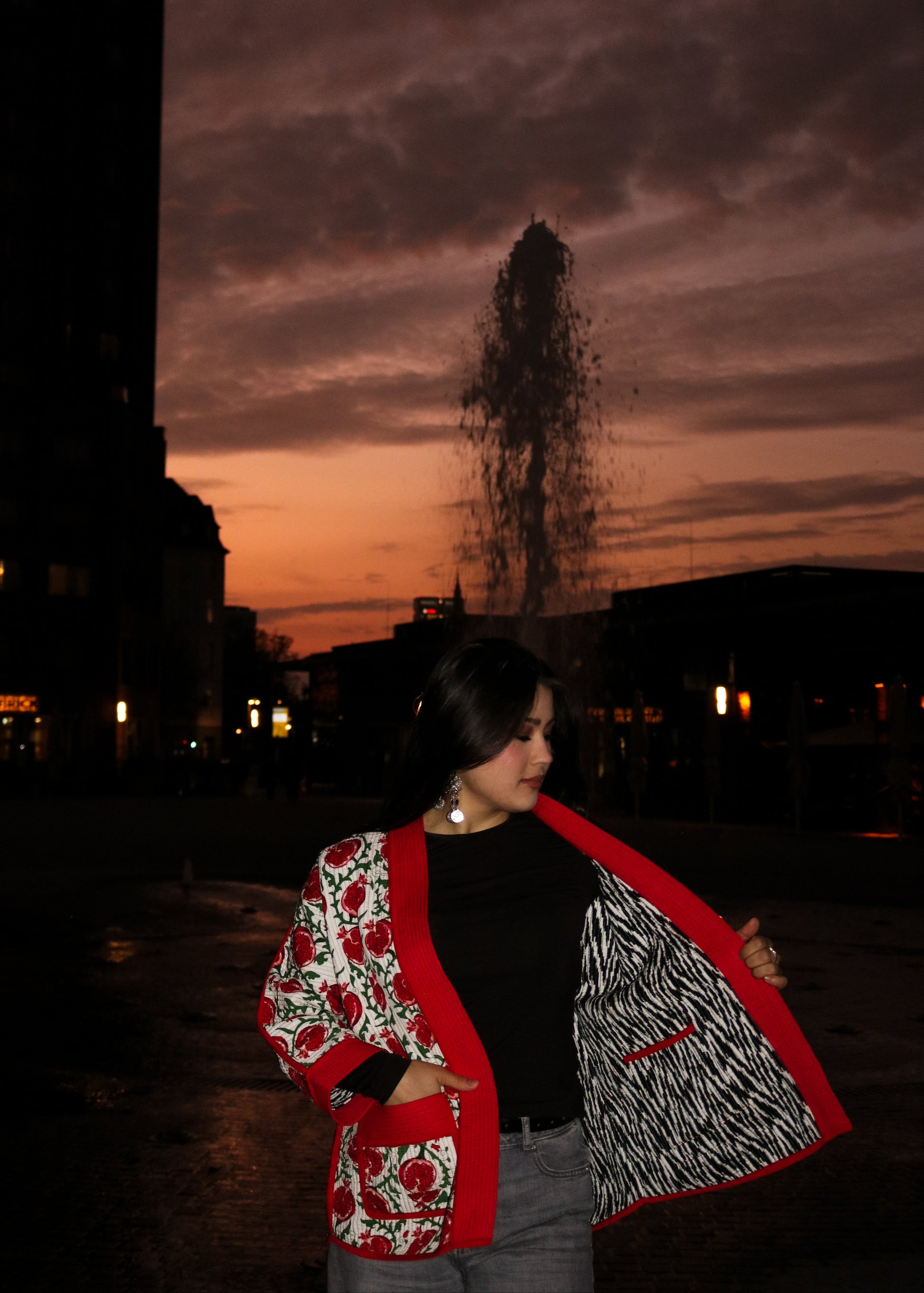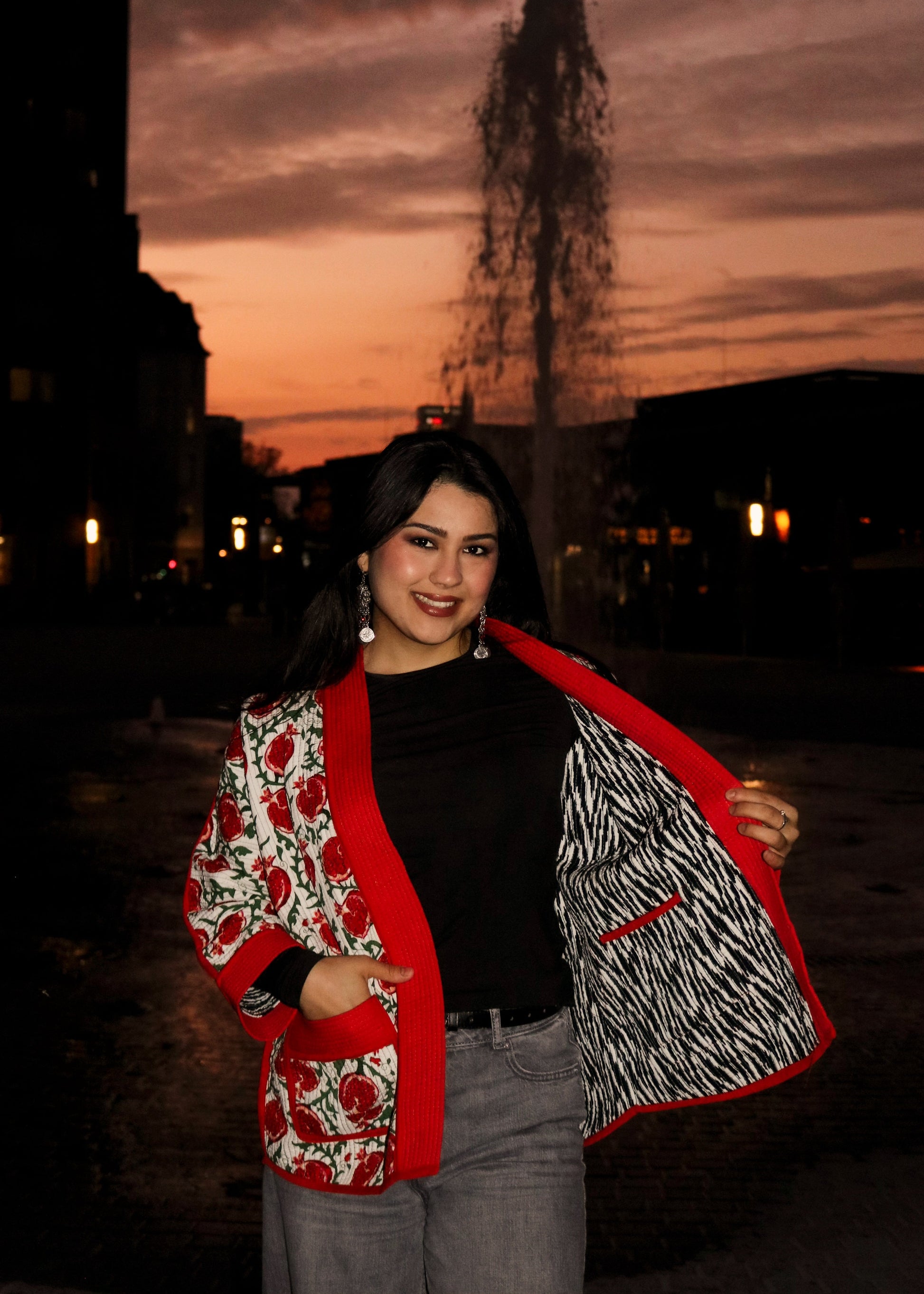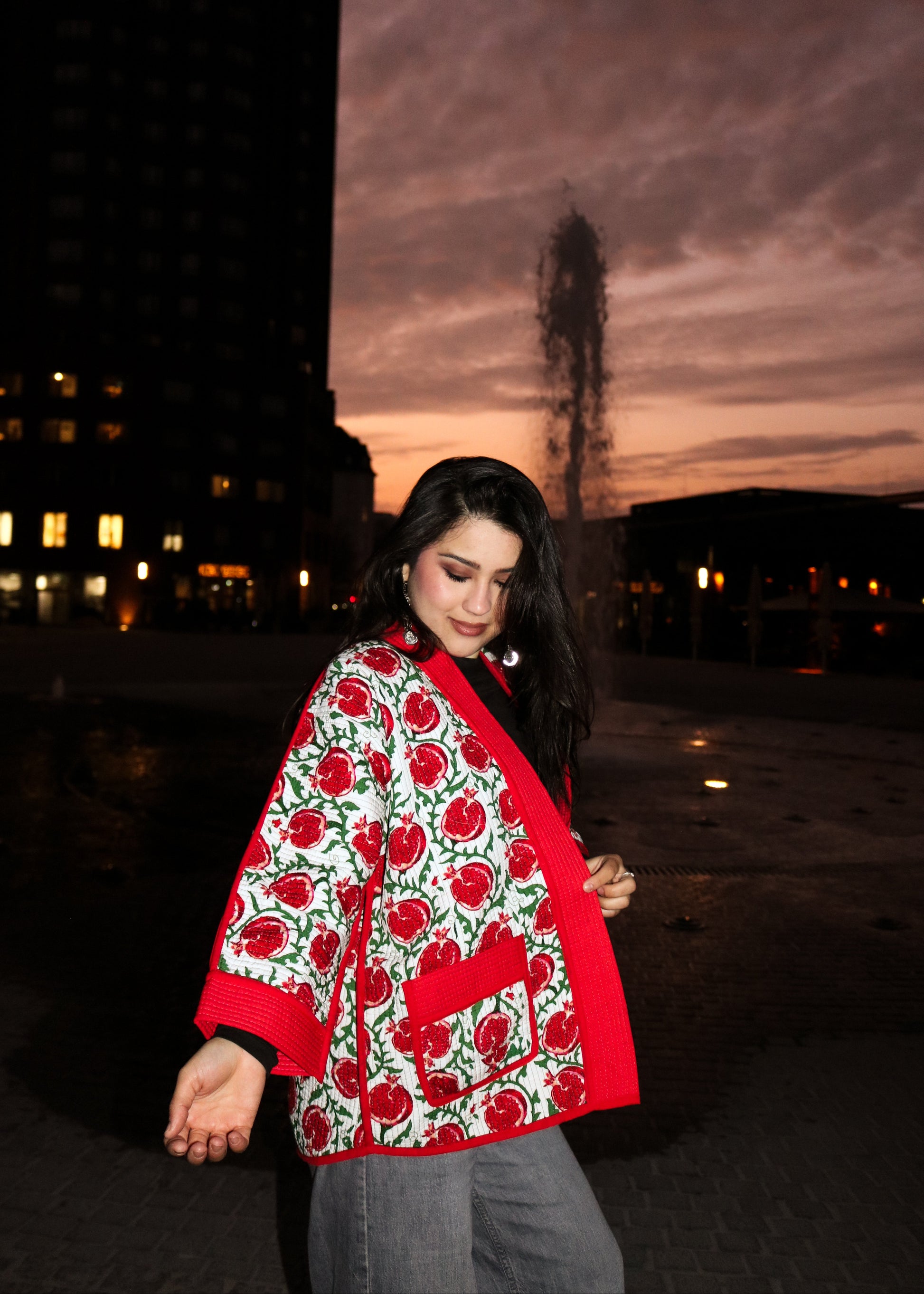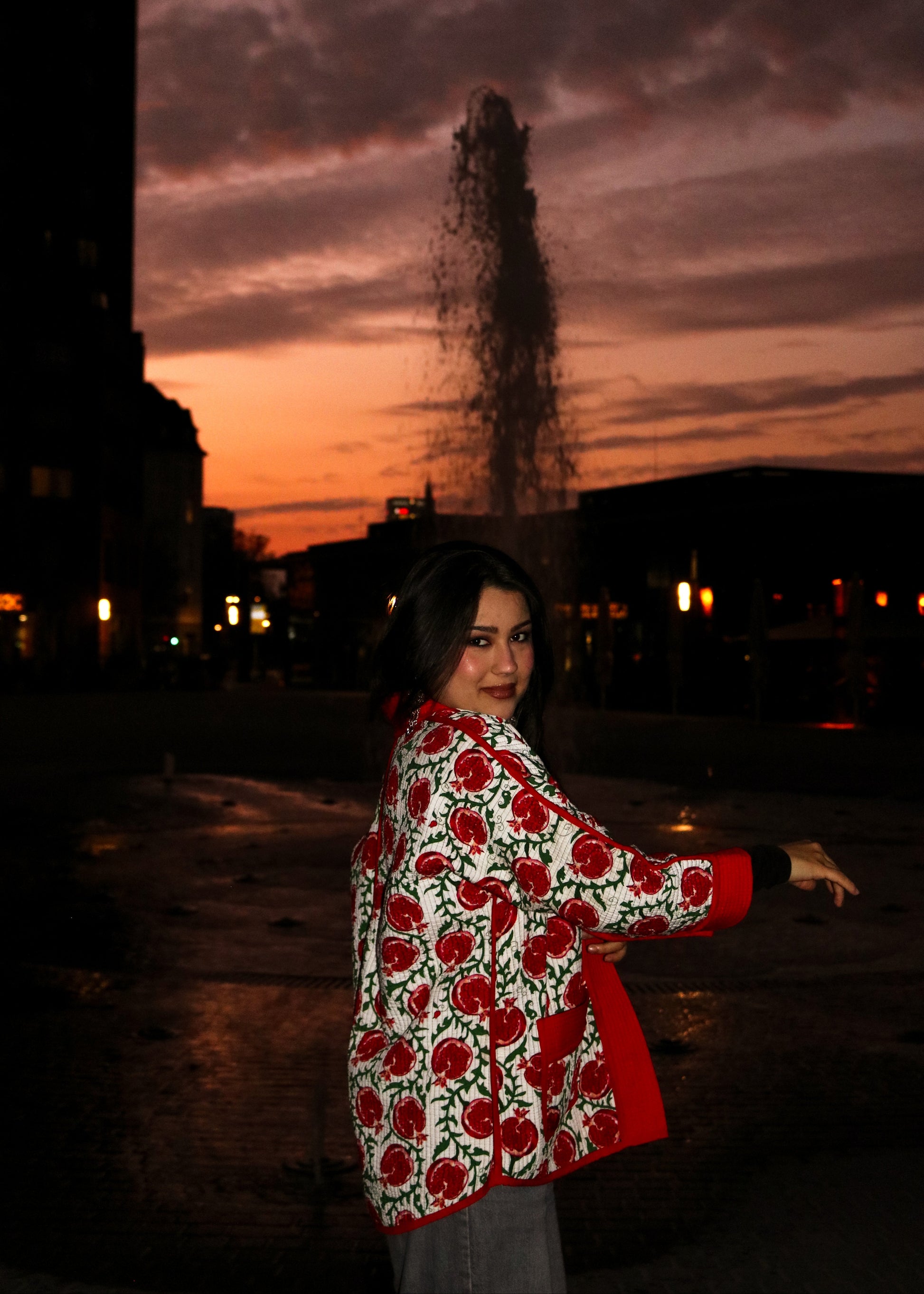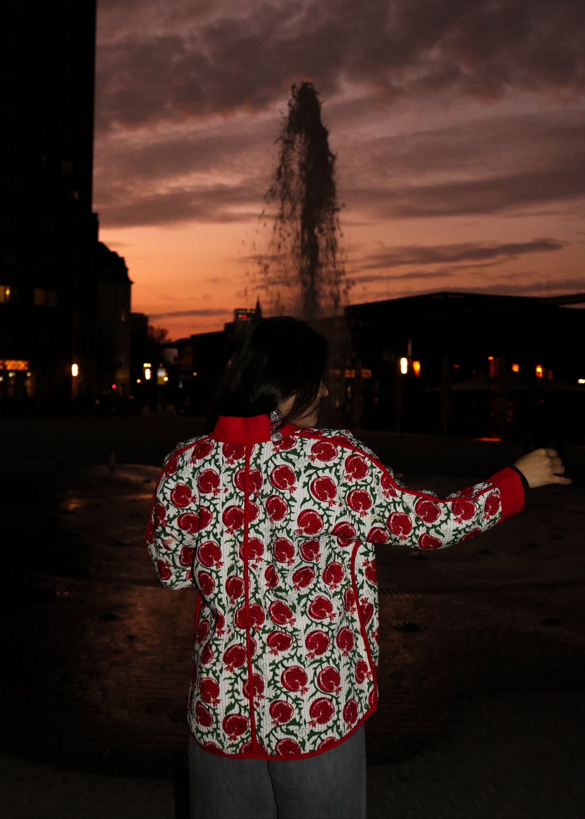 Auf der einen Seite leuchtet das traditionelle Granatapfelmuster in Rot, Grün und Weiß – Symbol für Fülle und Glück.